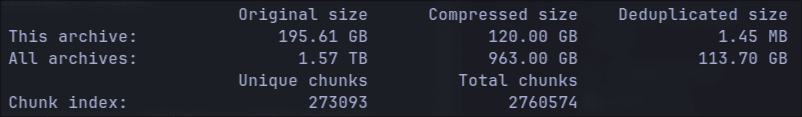As for setting it up, I was pleasantly surprised to see that both the nix modules for BorgBackup and Restic support creating multiple instances/systemd services so I think the reason the Duplicity’ module doesn’t have that is probably due to the lack of interest in it. Once again after the regular NixOS shenanigans like the only examples I could find being broken I finally have working automatic backups to my NAS. If you’ve never had the pleasure of using one of these tools check out my stats in Figure 1 . Across all snapshots my repository is only 113GB and the latest one added just 1.45MB to the repository because only a few files have changed since yesterday.