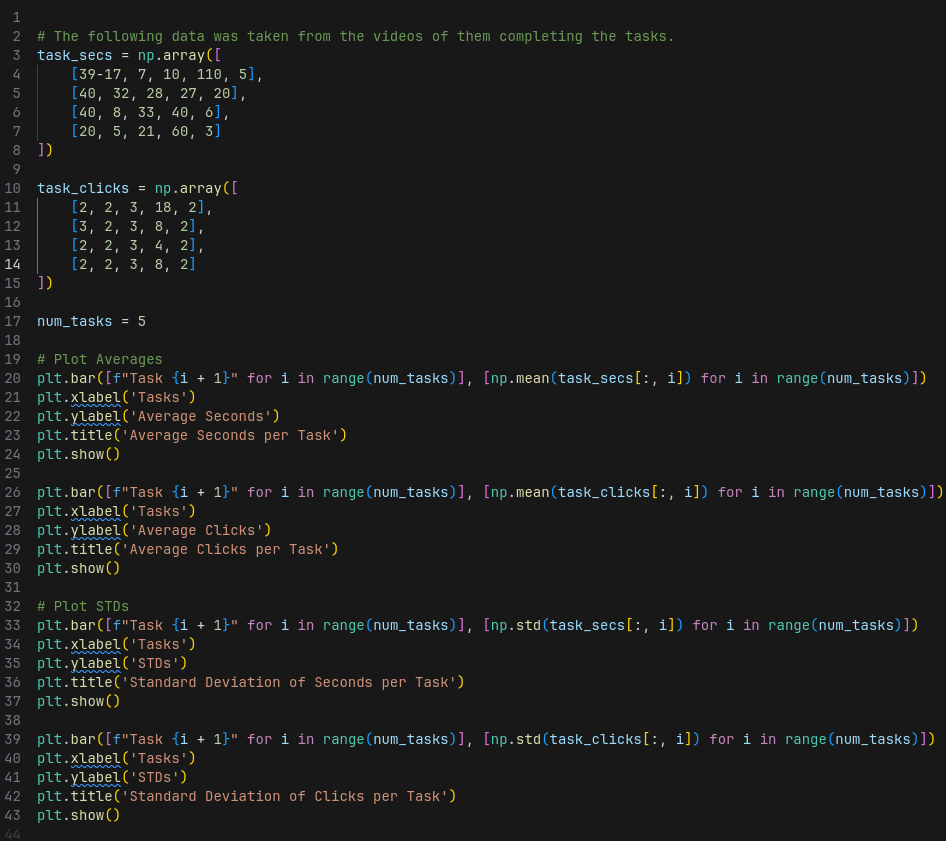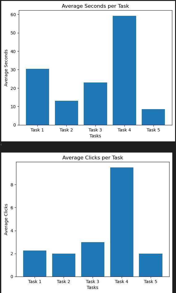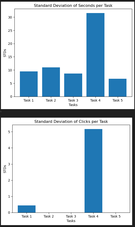 First we have the task completion performance by participants in the form of seconds taken and clicks taken to complete tasks. For these I plotted the averages and standard deviations for the Clicks and Seconds taken per task.