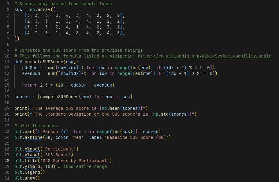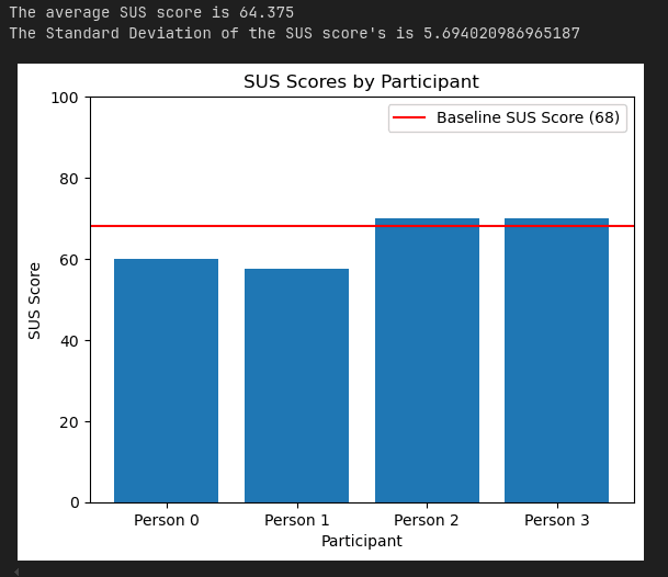 Then we generate the SUS scores from the google form participants filled out after completing the tasks. I plotted these per participants as well as provide the average and standard deviation of the score.
