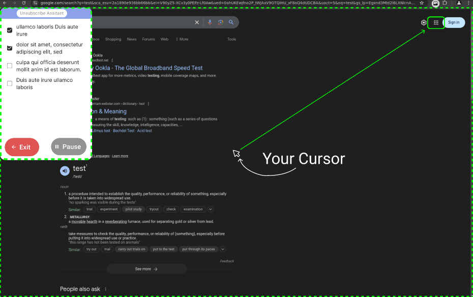 In order to keep the user informed about what is going on when they disable the extension, I color coded the power button icon and hid away the extension interface when disabled. This will clearly indicate to users that the extension is actively scanning the websites you visit or is instead disabled. Another area where the user needs to informed of the status is when the unsubscribe assistant is active. I opted to make this very obvious to the user by using a dashed green outline.